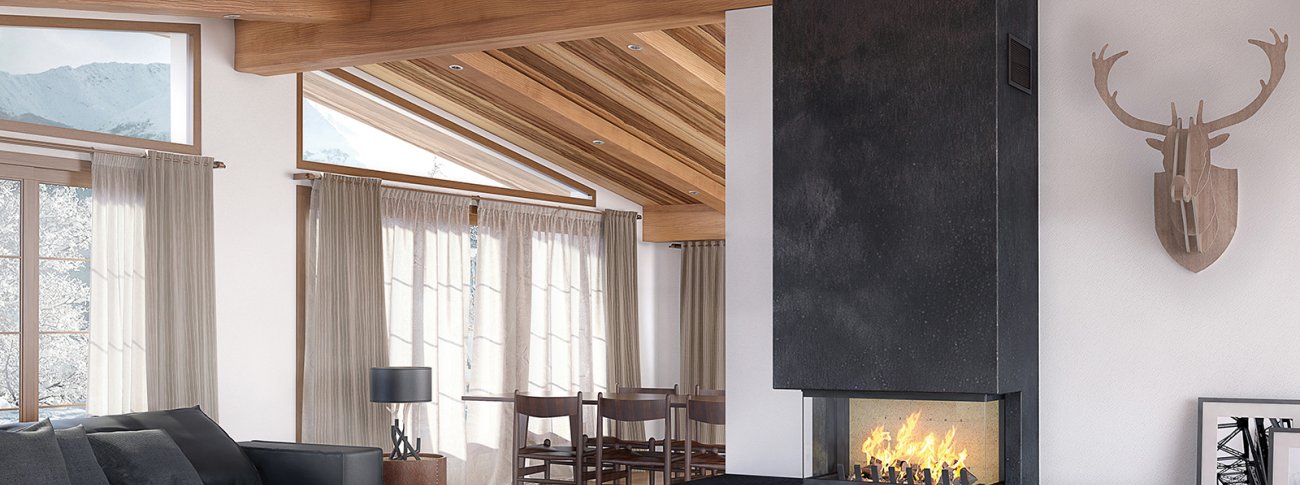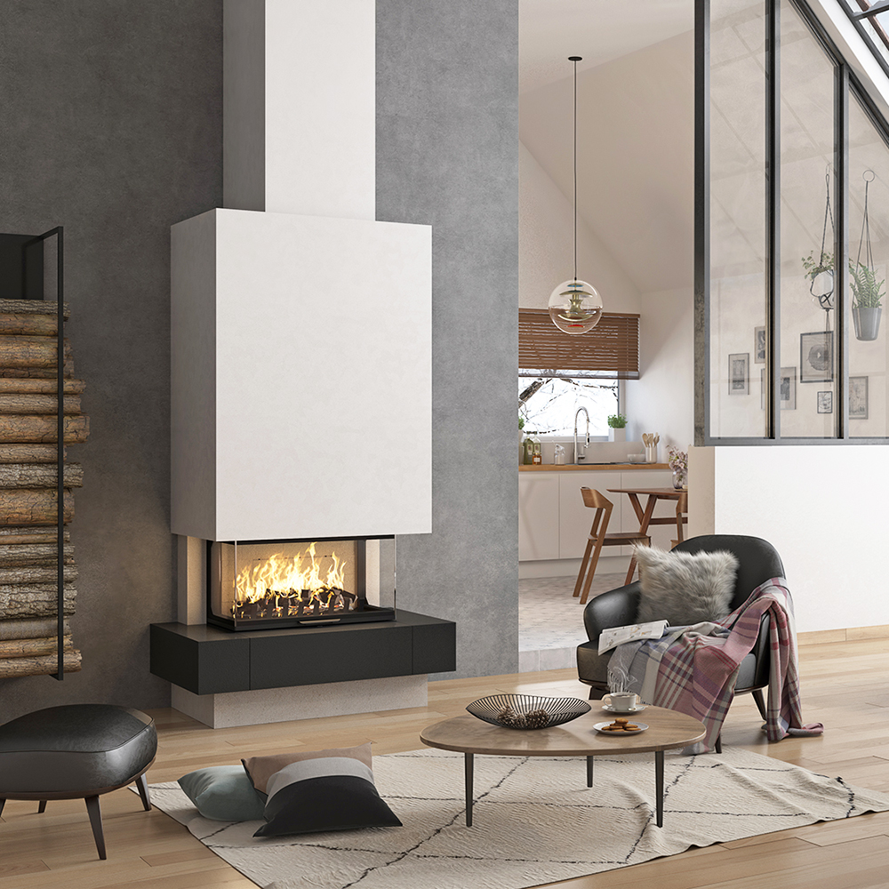 Para los amantes de las llamas, enamórese de esta chimenea de leña de 3 vidrios para disfrutar del espectáculo de fuego desde todos los ángulos. Su cristal negro serigrafiado subraya con elegancia la simplicidad de sus líneas.